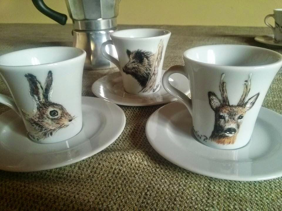 La richiesta è stata di due set da caffè con animali selvatici: cinghiale, capriolo, lepre, tasso, fagiano e ghiandaia.